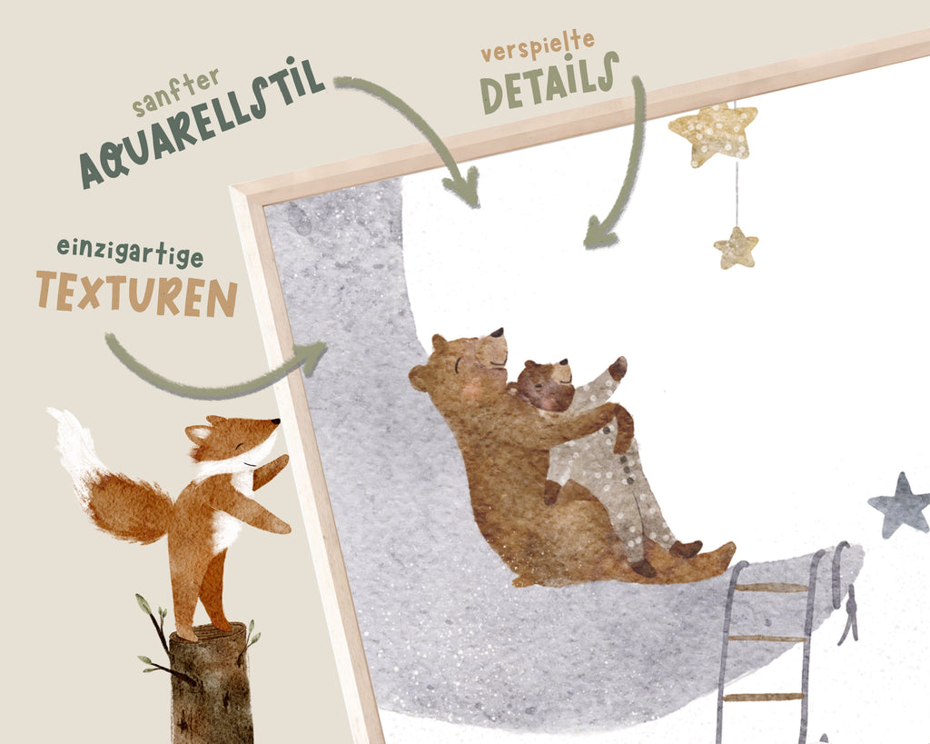Durch die fröhlichen, aber dezenten Farben fügen sich unsere Poster / Kinderbilder ganz wunderbar in euer Kinderzimmer (oder auch Wohnzimmer) ein. Auch als kleines Geschenk macht dieses liebevolle Set bestimmt nicht nur deinem Kind eine Freude, es zaubert auch den Erwachsenen ein Lächeln ins Gesicht, ganz locker und leicht, im Vorbeigehen.