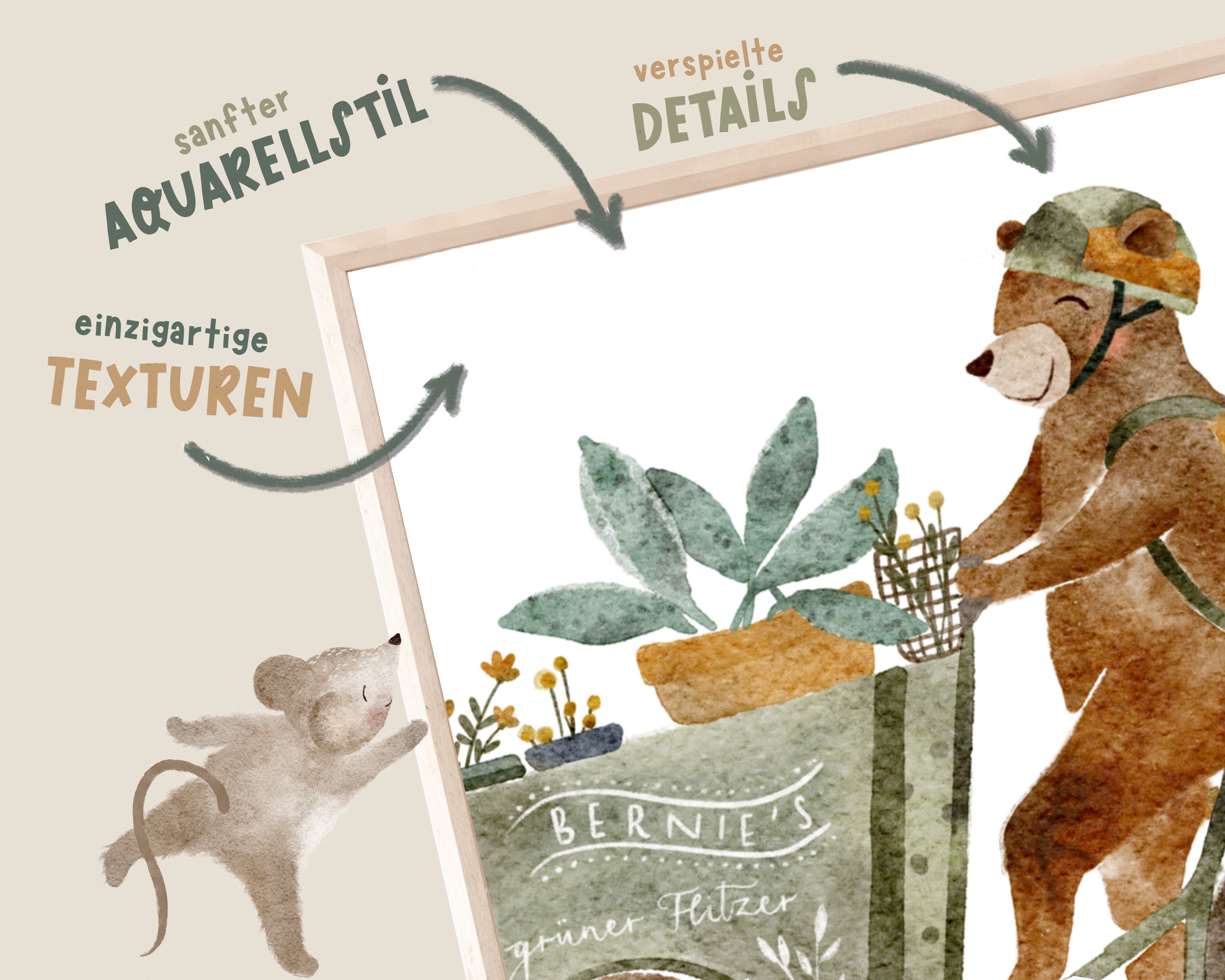 Durch die fröhlichen, aber dezenten Farben fügen sich unsere Poster / Kinderbilder ganz wunderbar in euer Kinderzimmer (oder auch Wohnzimmer) ein. Auch als kleines Geschenk macht dieses liebevolle Bild bestimmt nicht nur deinem Kind eine Freude, es zaubert auch den Erwachsenen ein Lächeln ins Gesicht, ganz locker und leicht, im Vorbeigehen.