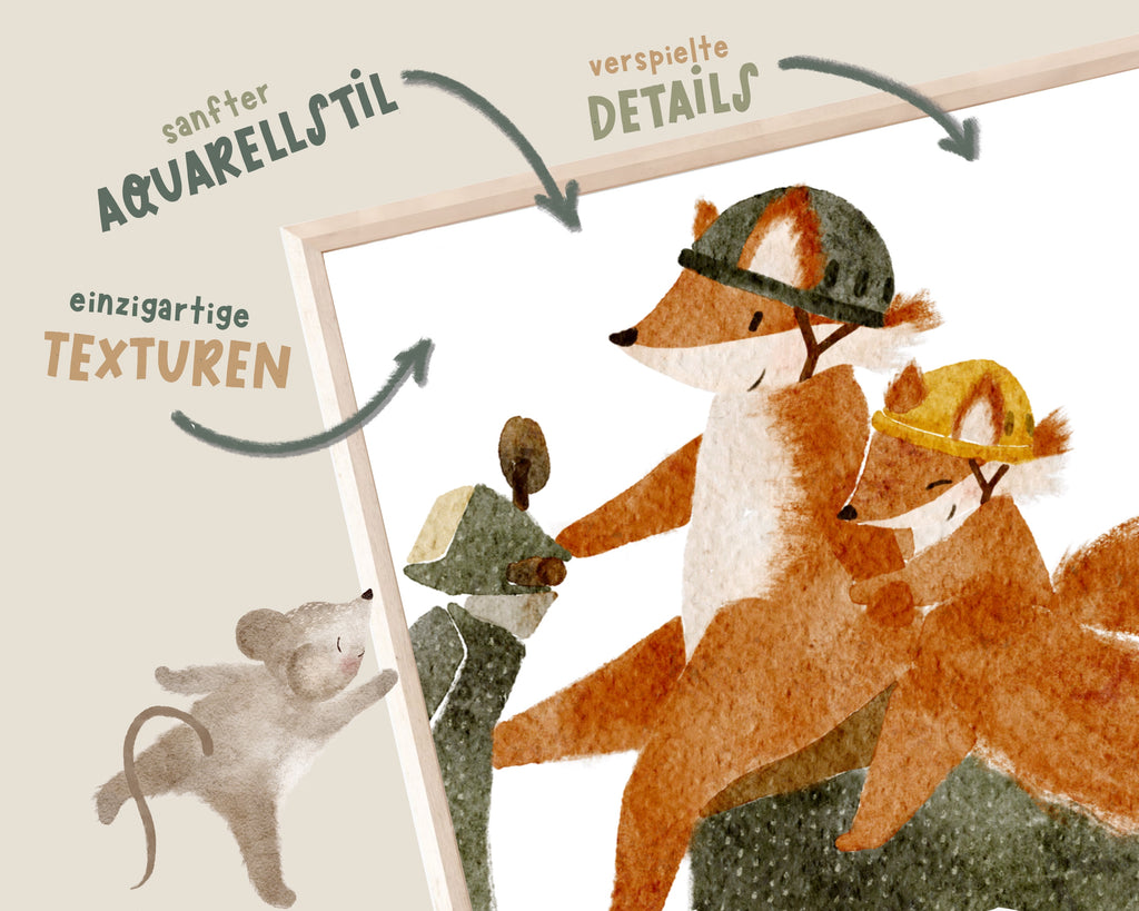 Jedes Motiv ist meine eigene Idee – oft inspiriert von Spaziergängen mit meinen Kindern – und liebevoll von Hand illustriert. Kleine Waldtiere voller Charme erzählen Geschichten, berühren Herzen und schenken Freude.
